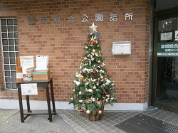 管理棟の前にクリスマスツリーを飾り、