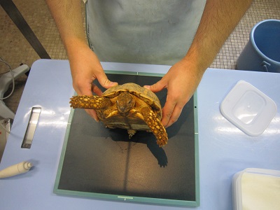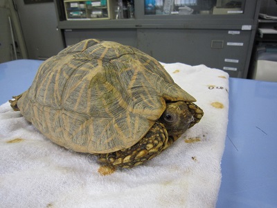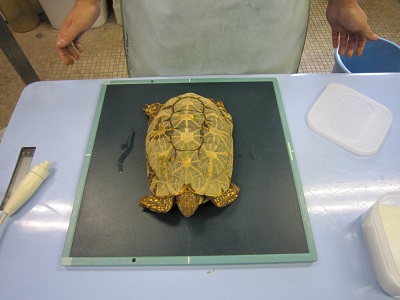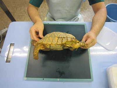 そのカメは、昨年の秋に体調を崩し、治療した際にレントゲンを撮ったところ、膀胱に結石がありました。