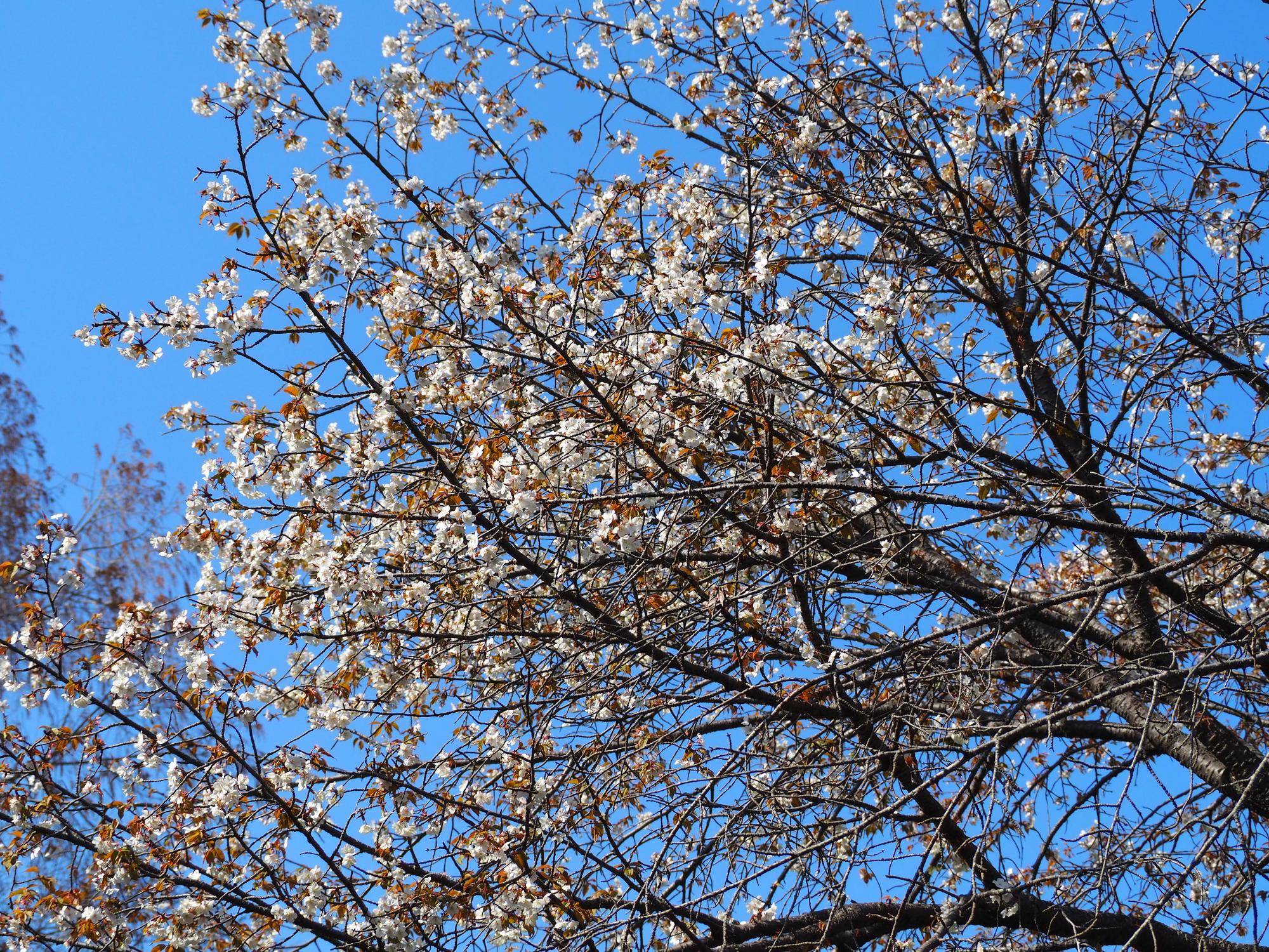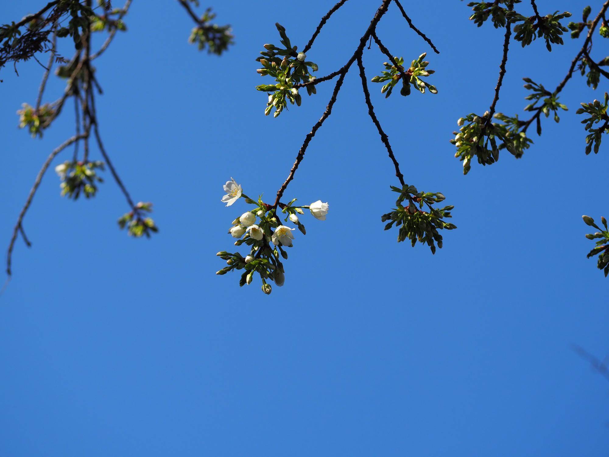 温室横のオオシマザクラ↓も開花しました。![]()