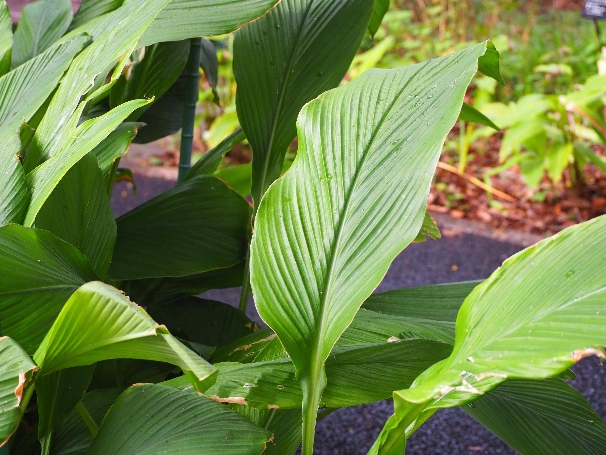 葉は、長楕円形で先がとがり肉厚で大きく、葉脈の筋が規則的に入ります。