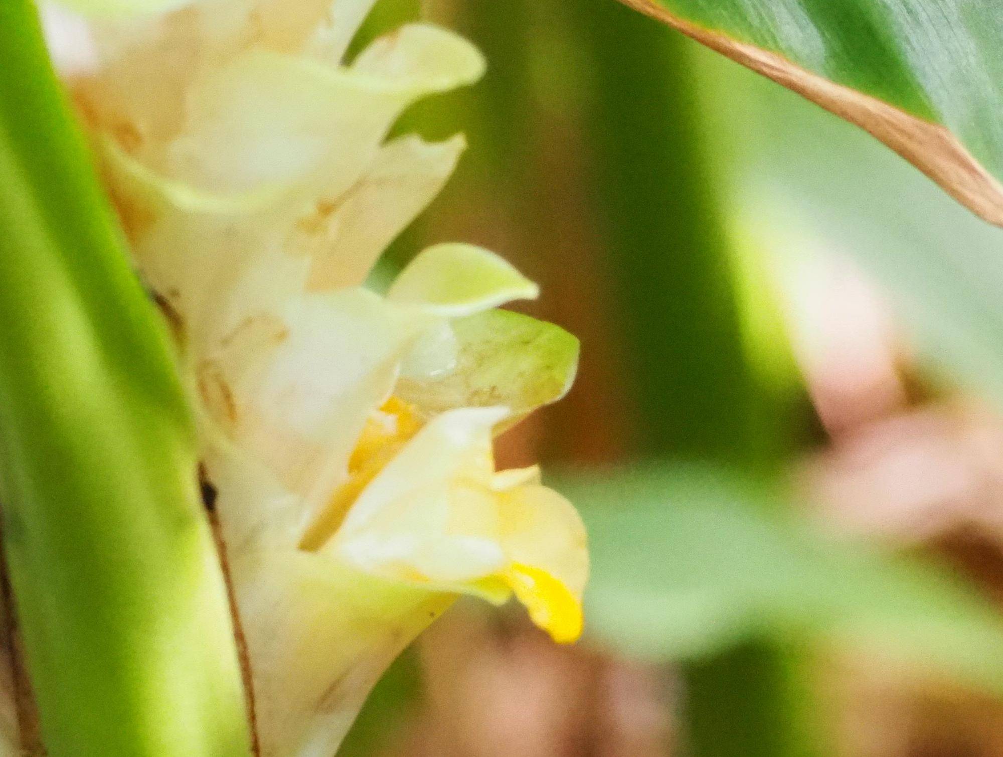 本当の花は、苞葉の間から咲く小ぶりの淡黄色の花です。