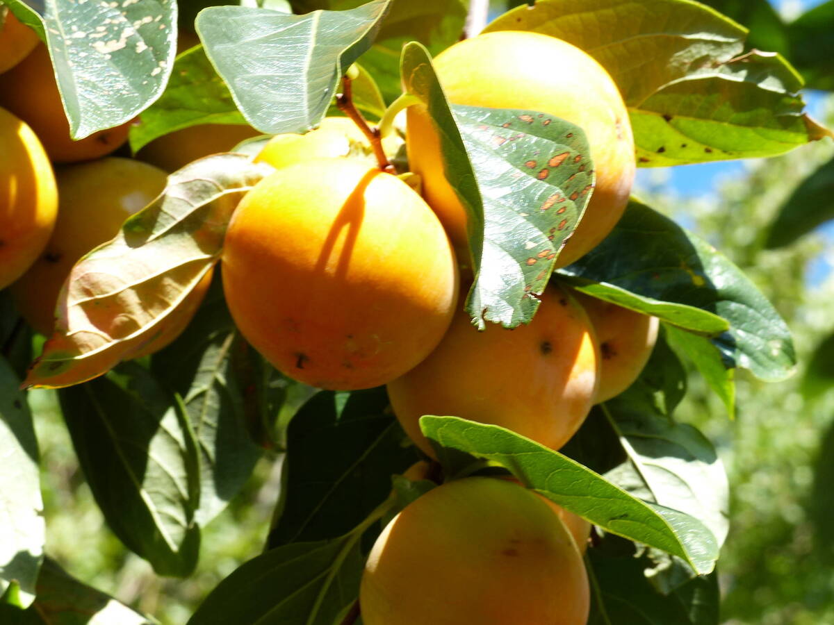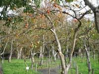 くだもの園には90品種前後のカキノキが植栽されています。秋の紅葉が美しく、その後たくさんの柿の実がオレンジ色に色づくため、こども植物園の秋の風物詩となっています。柿には甘柿と渋柿があり、それぞれ生食用として販売したり、干柿作りなど最近あまり行われなくなった活用の仕方を学べる講座で活用することもあります。