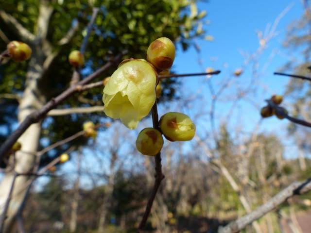 中国原産のロウバイのうち、中心部の花弁が暗紫色にならず、全体的に黄色のものをソシンロウバイといいます。花は1月のはじめから咲きはじめ、新年最初に咲く花としてよく知られています。花は品がよい香りを放ちます。