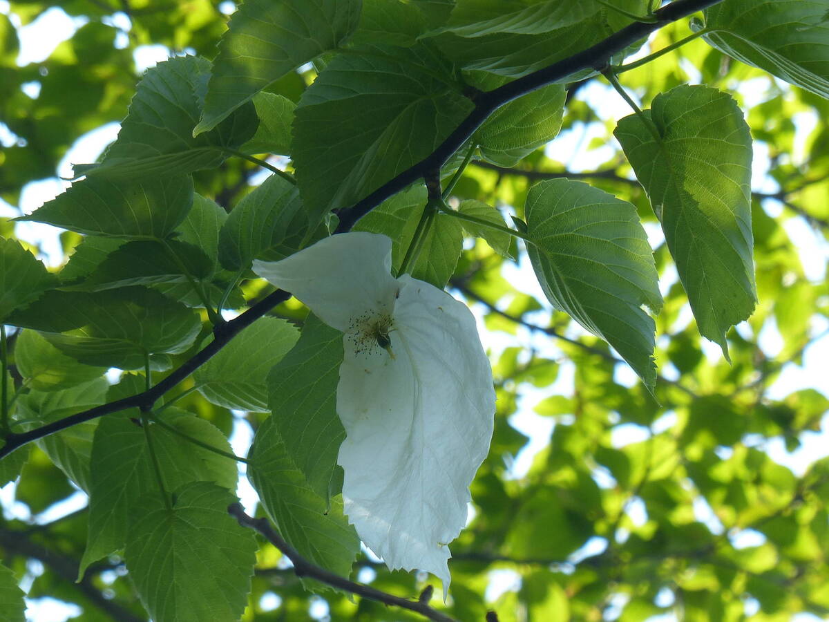 ヌマミズキ科。花期は5月上旬。植物界のパンダともいわれる1属1種の珍しい樹木で、中国南部原産です。花弁のように見える2枚の苞(ほう)が、ハンカチを垂らしたかのように開くためこの名前が付きました。別名をハトノキといいます。