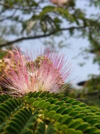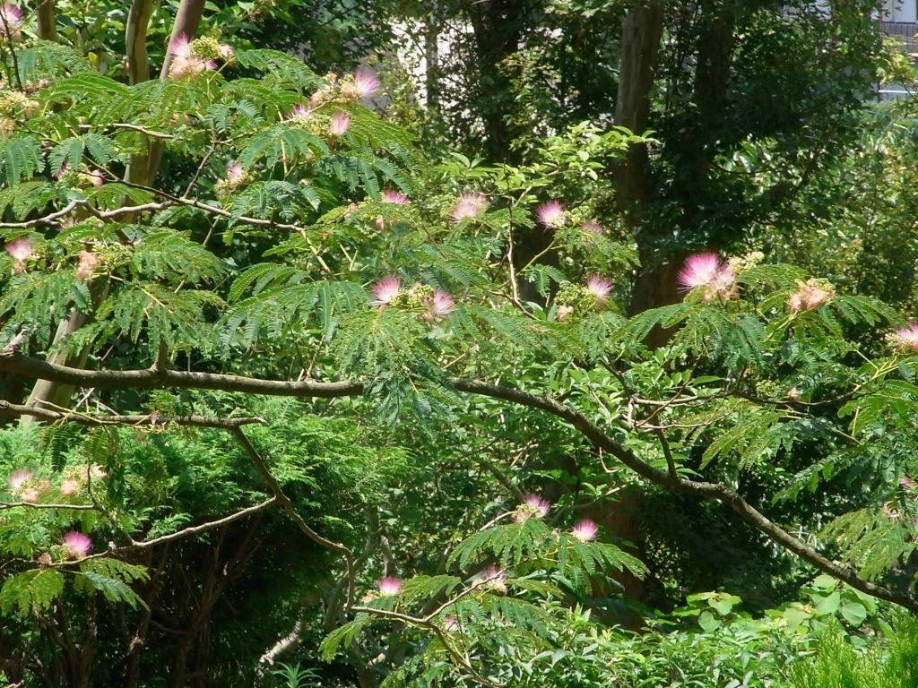 初夏から盛夏にかけ、比較的長い期間白からピンクのグラデーションが美しい花を咲かせます。鑑賞する部分はおしべです。マメ科なので夏の終わりには、細長い豆果をつけます。バラ園のほか、生垣園や野草園にも植えられています。