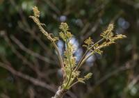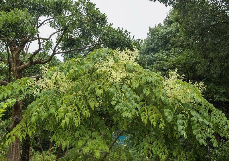 早春の新芽は山菜の「タラの芽」として、天ぷら等で食用にされます。葉は50~100cmの大きさで、小さな葉に分かれて見えますが、1枚の大きな葉(羽状複葉)です。幹や茎、葉に大きな棘があり、8月頃に白い小さな花がたくさん咲きます。コンパニオンプランツと呼ばれ、撹乱された荒れ地に多く自生し、生長が速いのが特徴です。