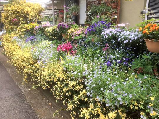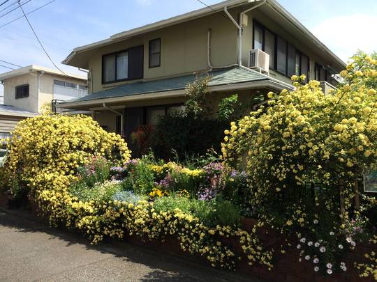 道歩く方に見ていただけるよう、花いっぱいに咲かせています。モッコウバラも見事です。