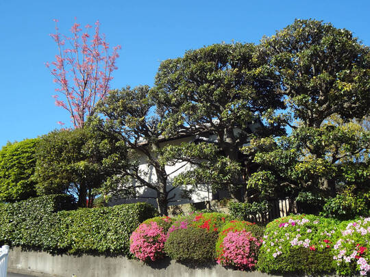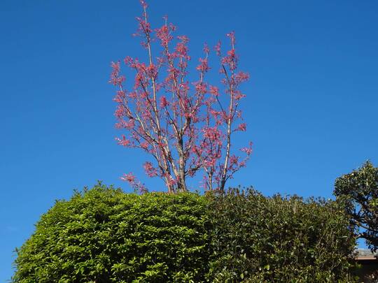 中国原産の落葉高木。3月末ころに発芽し、4月いっぱいが見頃です。当初は濃い紅色がやがて淡い色に変色します。遠景からは満開の桜か桃の花を連想させます。
