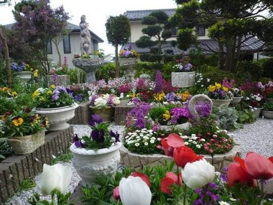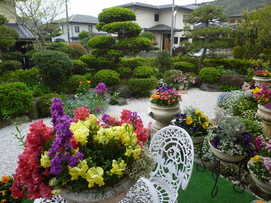 和風の庭にある花壇とアンティーク調の鉢には、バラを中心に花がいっぱいです。