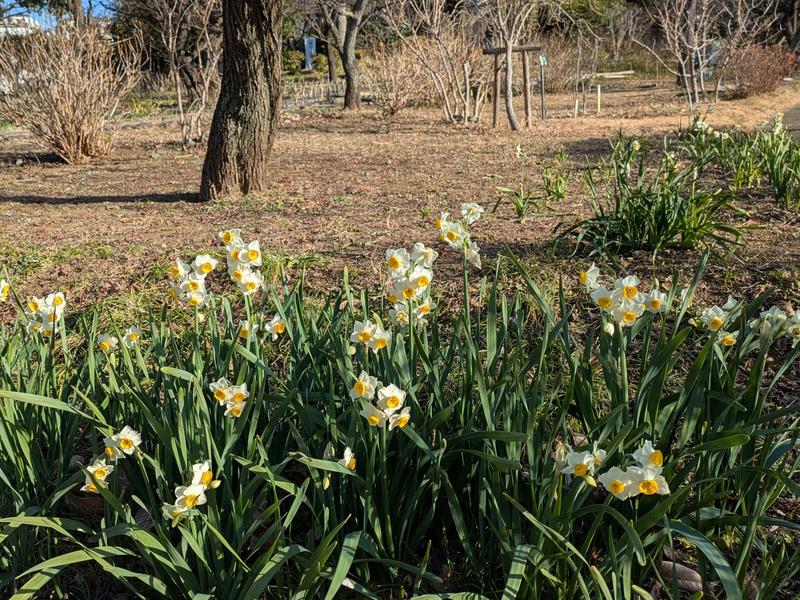 梅林近くの園路沿いや、古民家主屋の周りでは、水仙(スイセン)がきれいに咲いています。
