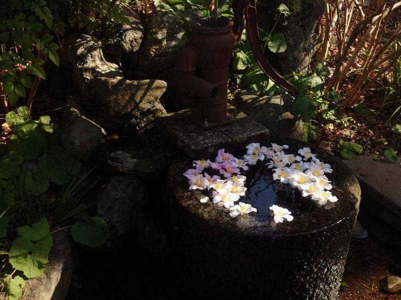 主屋近くの井戸には、山茶花や、きれいに散った椿を浮かべていることもあります。