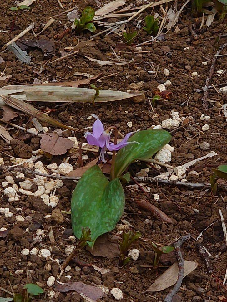 山野草エリアの竹林側の石段沿いでは、赤紫色の片栗(カタクリ)のお花が咲いています。