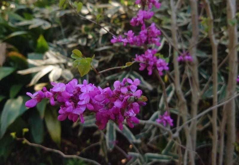 古民家の正門入ってすぐの園路などで、花蘇芳(ハナズオウ)が咲いています。