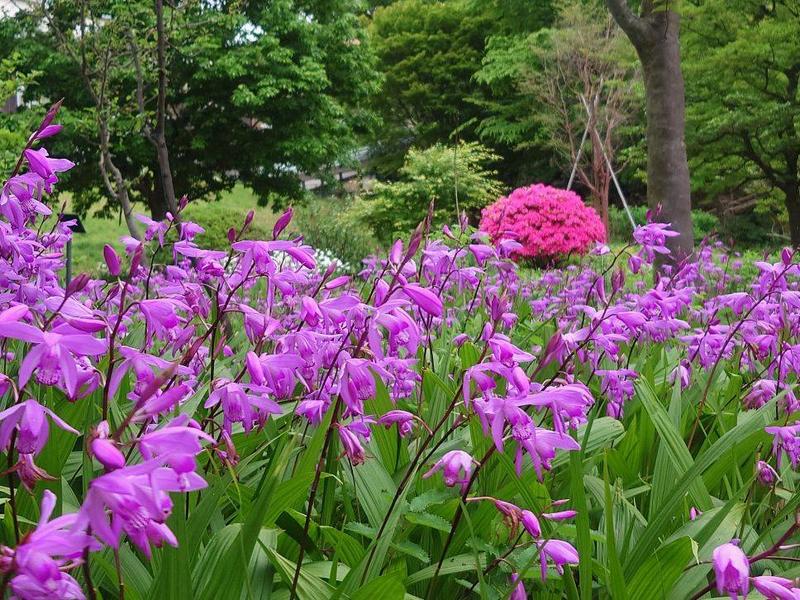 園路を歩いて山野草エリアに入り、カーブに沿って、紫蘭(シラン)がいっぱいに咲いています。