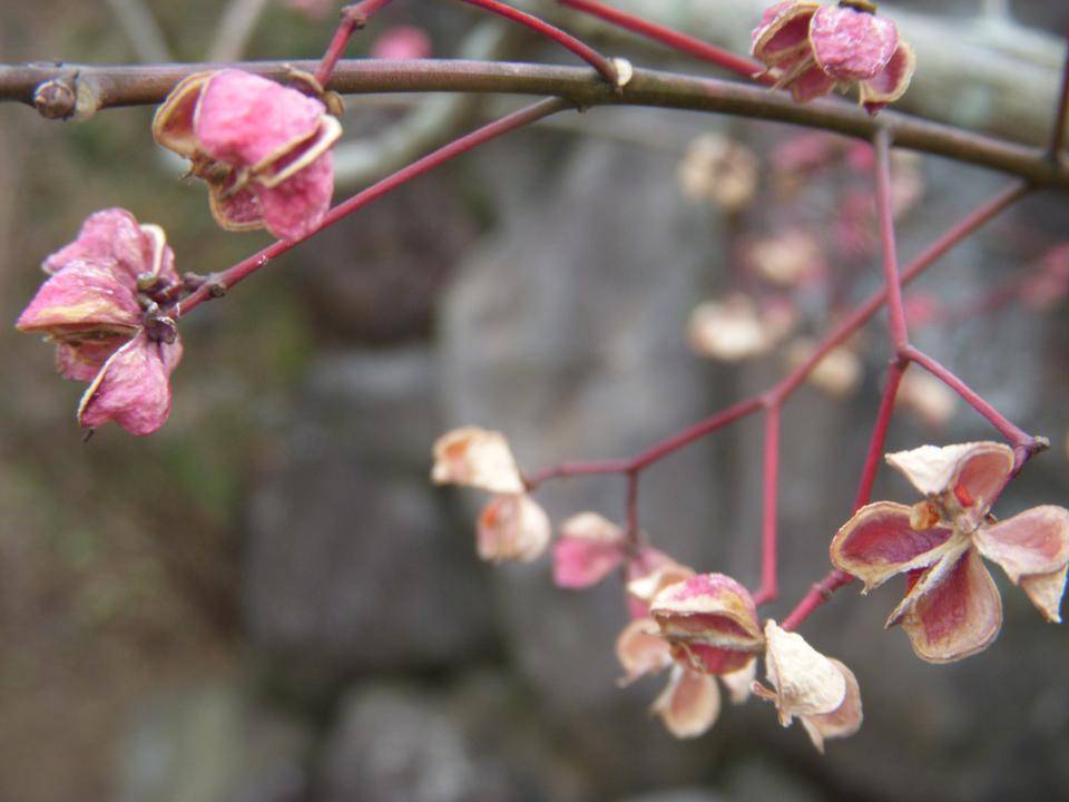 秋になると茶色がかったオレンジ色に美しく紅葉する落葉低木です。それにもまして美しいのがピンク色の四角い果実で、熟すと中から紅色の仮種皮(かしゅひ)に覆われたタネが現れ、落葉後も残ります。木の質は緻密で粘りがあり、現在でも将棋の駒などの材料として利用されます。