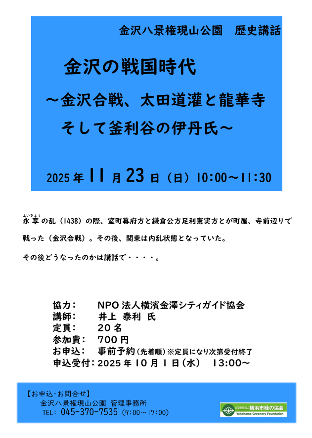 更新日:2025.10.06歴史講和 更新日:2025.10.06 歴史講和 開催日 11月23日(日) 時間10:00~11:30 場所金沢八景権現山公園 旧円通寺客殿 この記事をシェアする Facebook Twitter LINEで送る