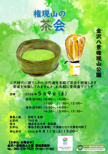 更新日:2026.04.12権現山の茶会 更新日:2026.04.12 権現山の茶会 開催日 5月 9日(土) 時間10:00~16:30 場所金沢八景権現山公園 旧円通寺客殿 5月に茶会があります。すべて予約制です。 この記事をシェアする Facebook Twitter LINEで送る