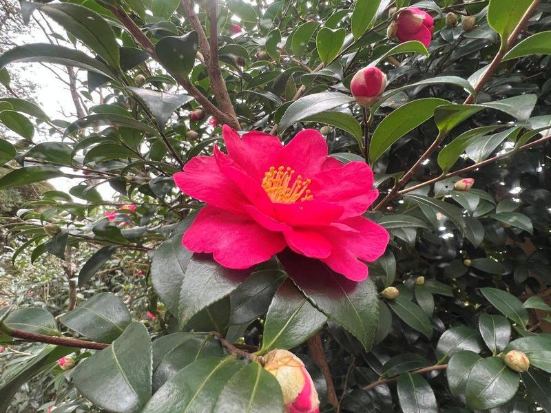 どんよりとしたグレーの風景の中、鮮やかに咲くサザンカの花がひときわ目を引きました。