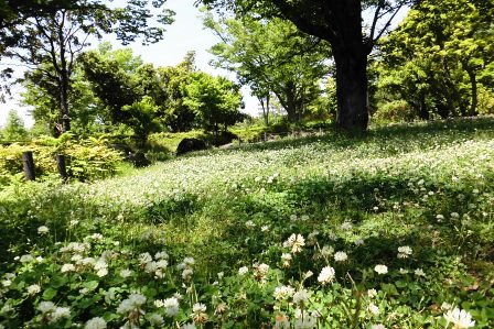 爽やかな気候のなか、公園内のシロツメクサのうえで