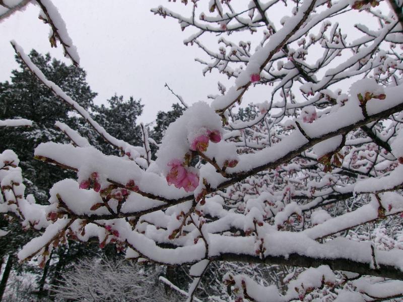 ▼開花したカワヅザクラに雪が積もっています。(四季の花苑)