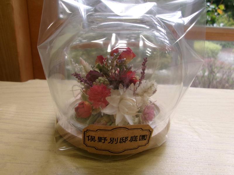 庭園の植物でドライフラワーを作り、ガラスドームの中でミニアレンジに仕立てました。
