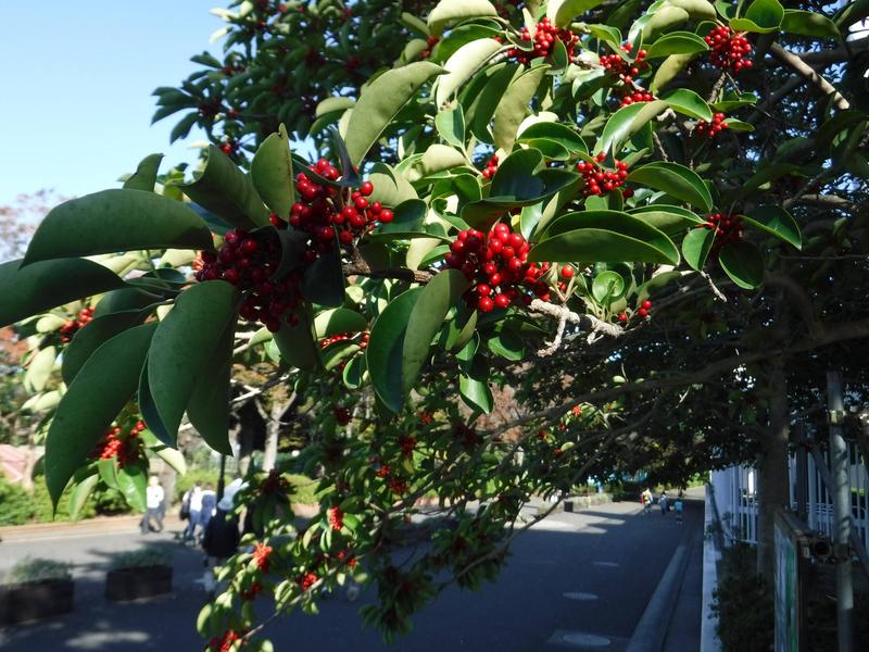 ニッパツ三ツ沢球技場前にあるクロガネモチ、いつの間にか赤い実がたくさんついていました。