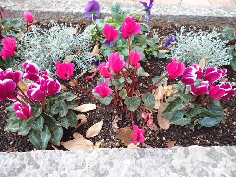 花壇をパンジー、ハボタン、シクラメンなどの冬苗に入れ替えました。
