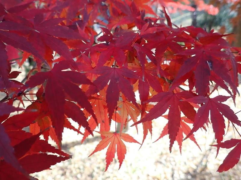 イチョウの葉のじゅうたんに赤いモミジの葉が映えます。