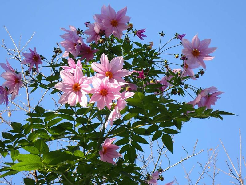 皇帝ダリアはとても草丈が高く、この株もゆうに2mは超えています。日が短くならないと花芽がつかない、という習性をもっているため、11月下旬~12月上旬が見ごろになります。