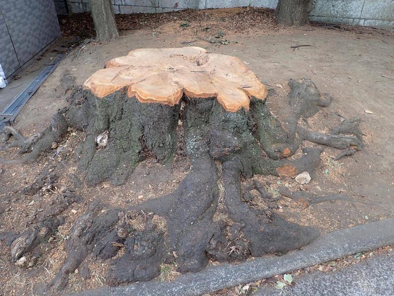 もしもこれだけ大きな樹径の木が倒れたらと考え、伐採という結論に達しました。