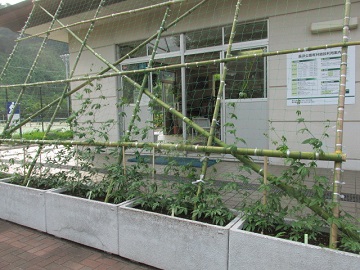 レストハウス正面にボランティアの方々、そしてテニスの後に協力していただいた方々が植えてくださったグリーンカーテン用の『オキナワスズメウリ』がグングン成長しております!