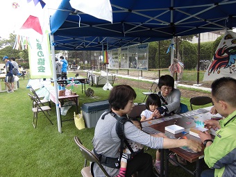 天然芝の周りでは、体力測定、昔遊び、鯉のぼり作り、トンボ制作、サッカーコーチによるミニサッカーなど、