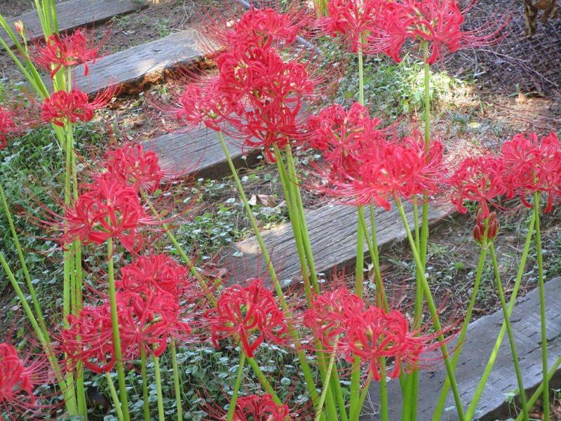 お彼岸の頃を迎え、園内のあちらこちらに彼岸花が咲いています。この時期を待っていたかのように突然茎をすっと伸ばして、花が開花します。鮮やかな赤のイメージがありますが、園内には白い花も咲き、綺麗です。季節は秋へと移ろい始めました。