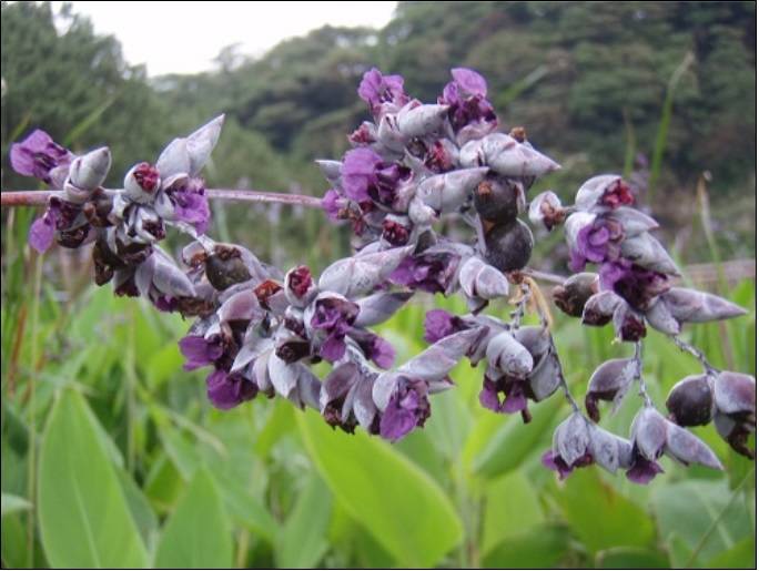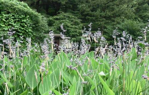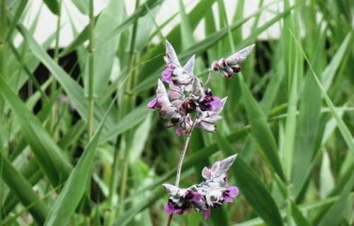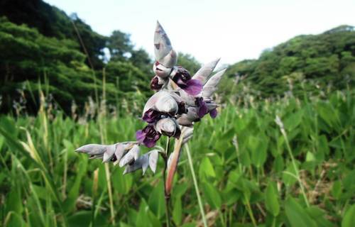 紫色の花と白い萼の色が混ざりあい、紫白色に見える美しい花を咲かせる、草丈の高い水辺の植物です。