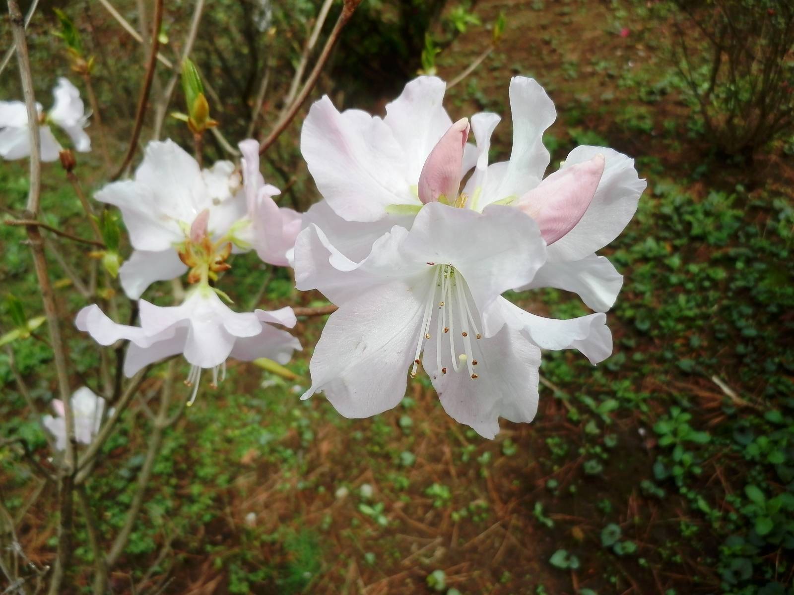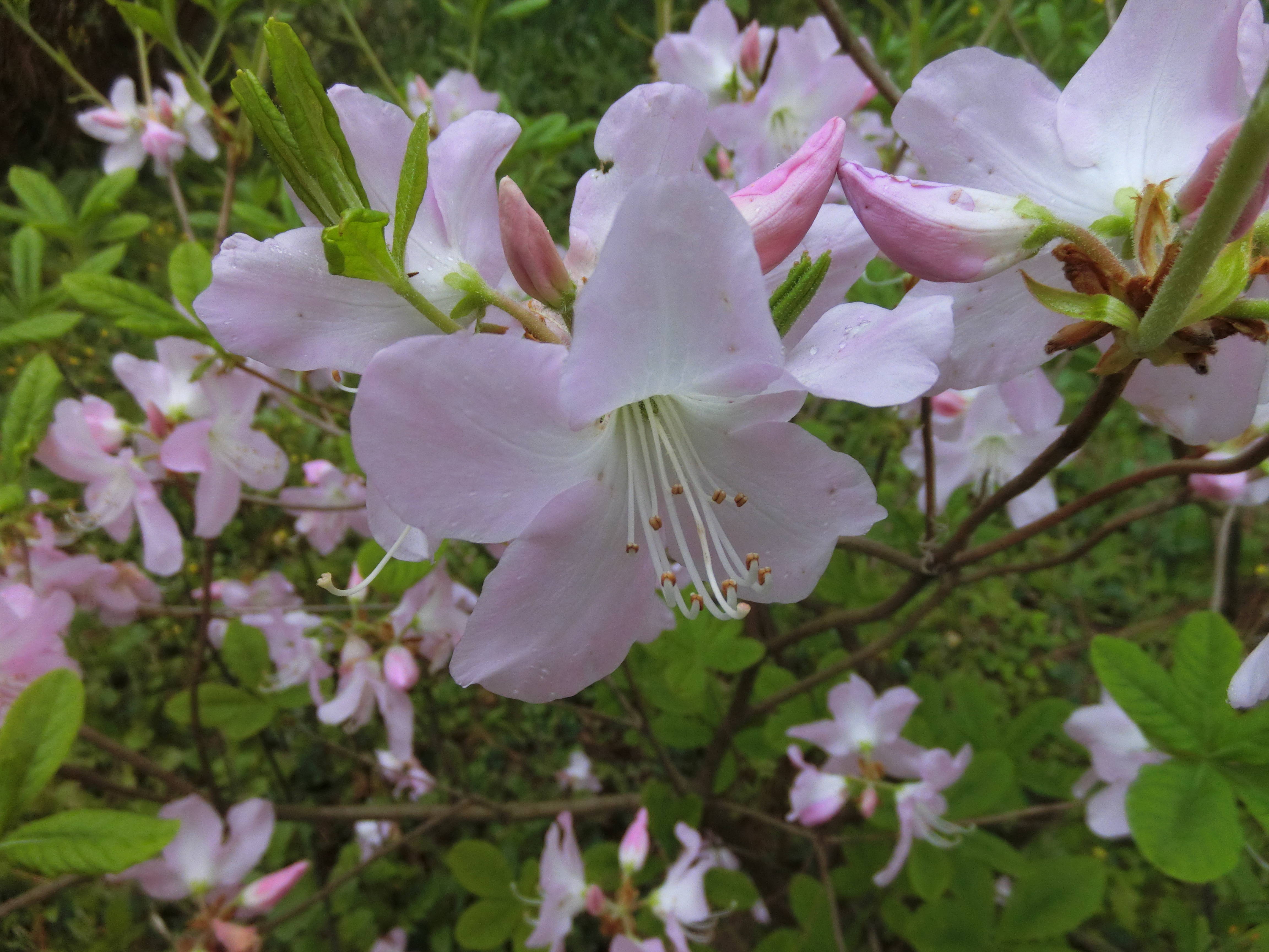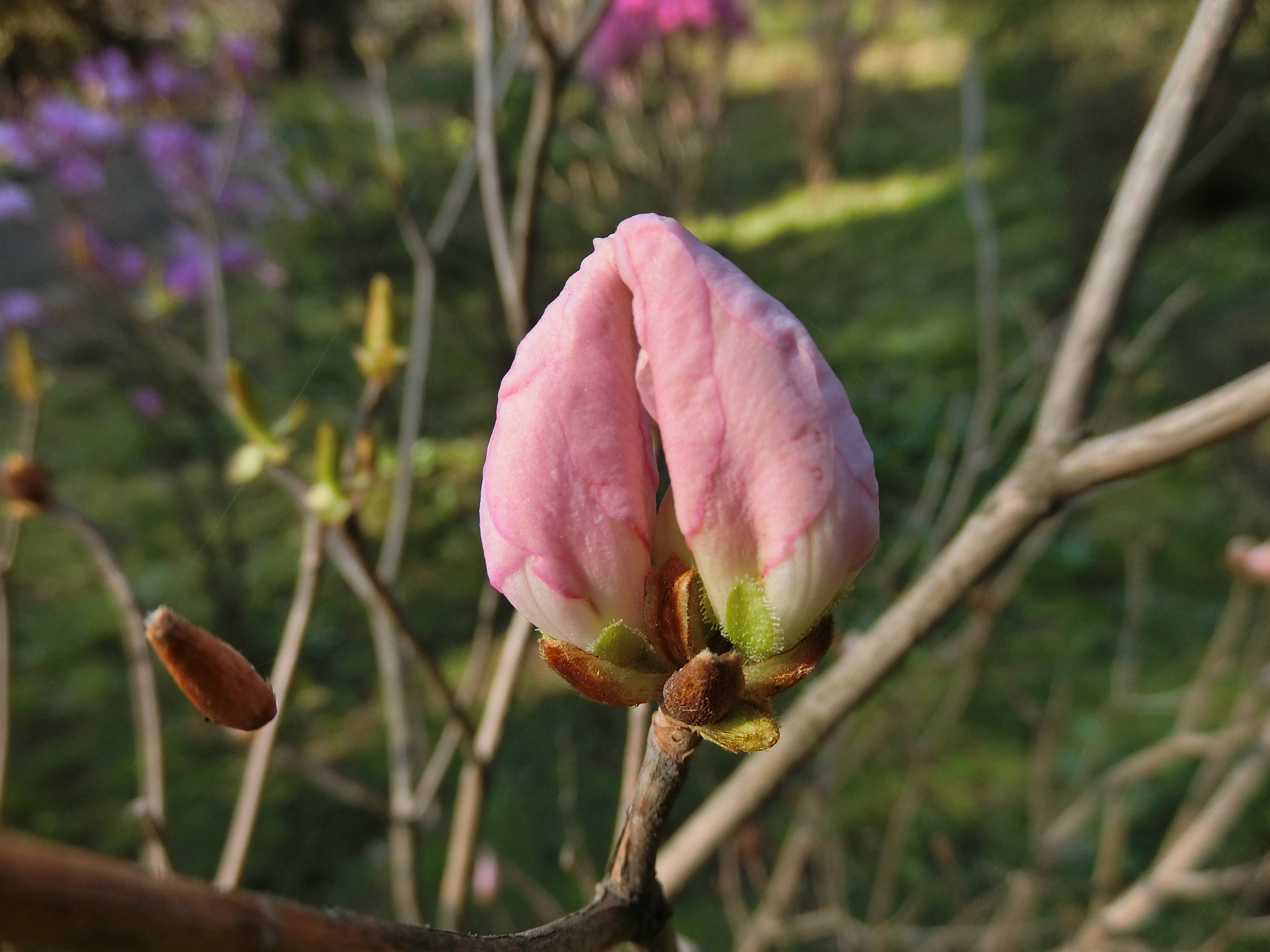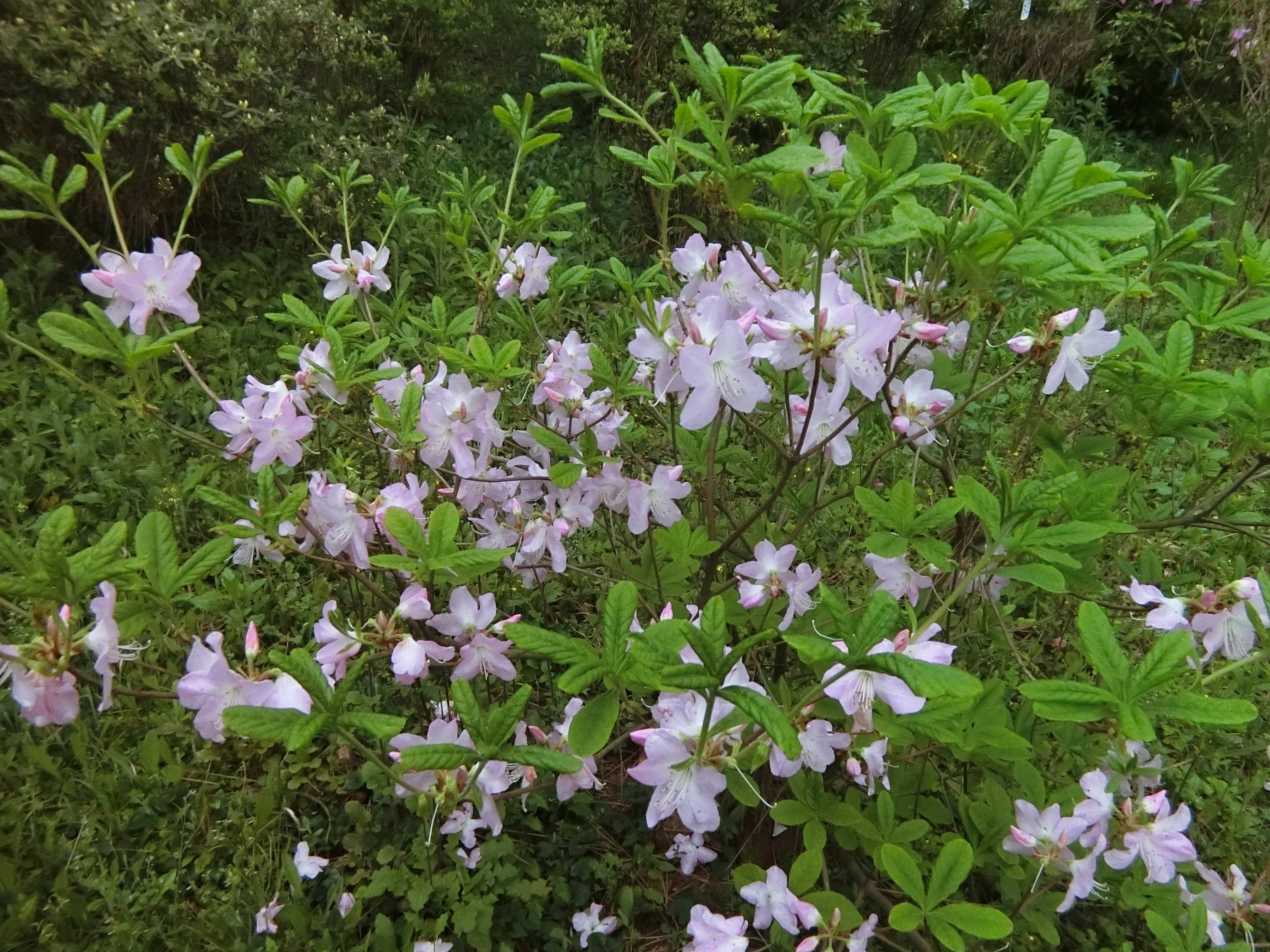 クロフネツツジは、臨海公園の八聖殿の見晴らし台からダスト広場側に下る園路沿いに開花します。清楚で上品なピンクの花を咲かせ、その美しい姿から「ツツジの女王」と呼ばれています。朝鮮半島~中国北部に自生し、日本には江戸時代に黒船によって持ち込まれた、というのが名前の由来です。