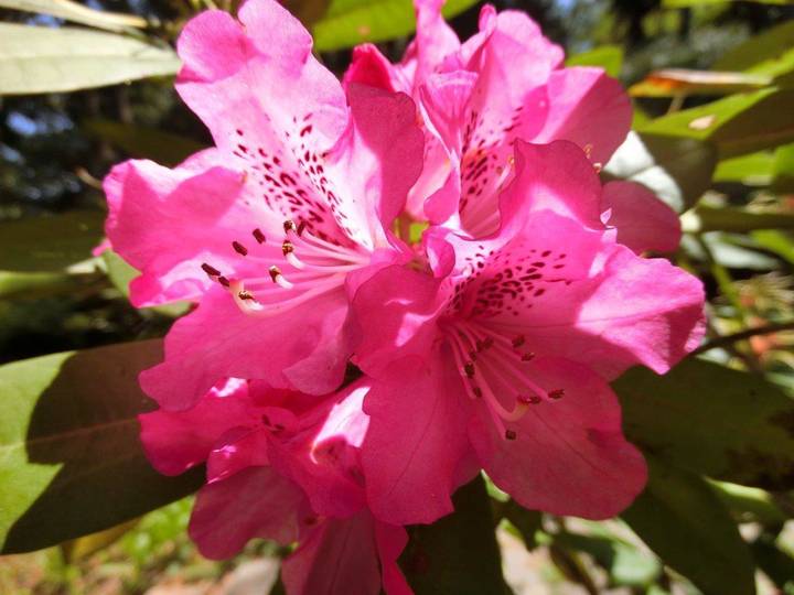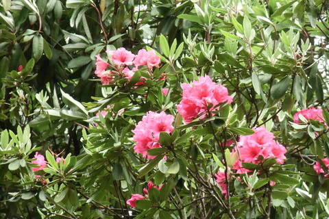 シャクナゲは、ツツジ科の常緑性の花木で、4月下旬~5月中旬に開花します。臨海公園の八聖殿の見晴らし台からダスト広場側に下って行く園路沿いで、鮮やかで豪華な花を咲かせます。