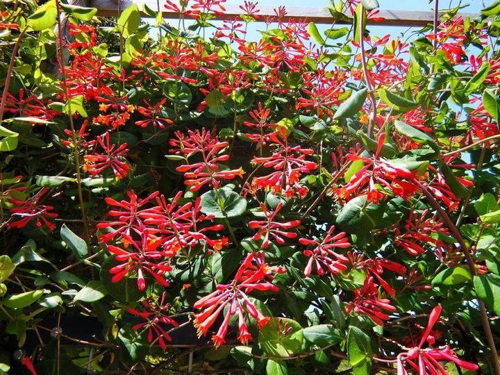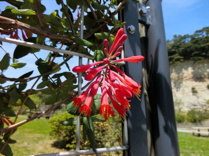 ツキヌキニンドウは、スイカズラ科のつる植物で、鮮やかな花を咲かせます。上海横浜友好園の近くの園路沿いにあり、初夏から秋まで長期間開花します。