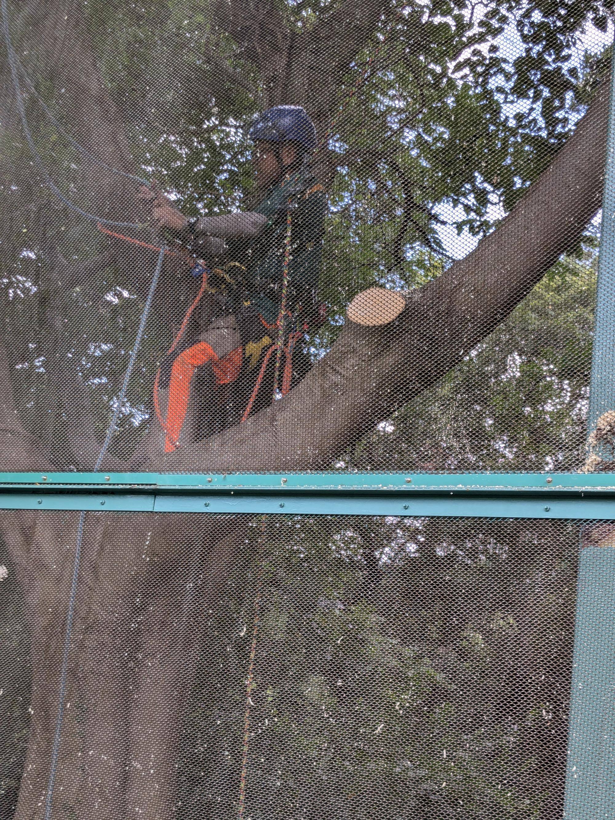 1か所は、アーチェリー場のフェンスを飲み込みそうな大枝の除去です。フェンスの反対側は傾斜地になっており、作業が難しいことから、ツリークライミングの技術を持つ巡回作業班の班長さんが伐採に当たってくださいました。