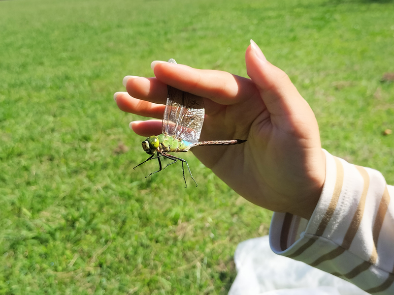 午前11時グラウンドでサッカーの練習が始まったので、ボタン園に戻りました。ジュニア調査員が珍しいトンボを捕獲しました。皆さんざわつきます。てもとの図鑑に載ってません。ネットでも調べます。