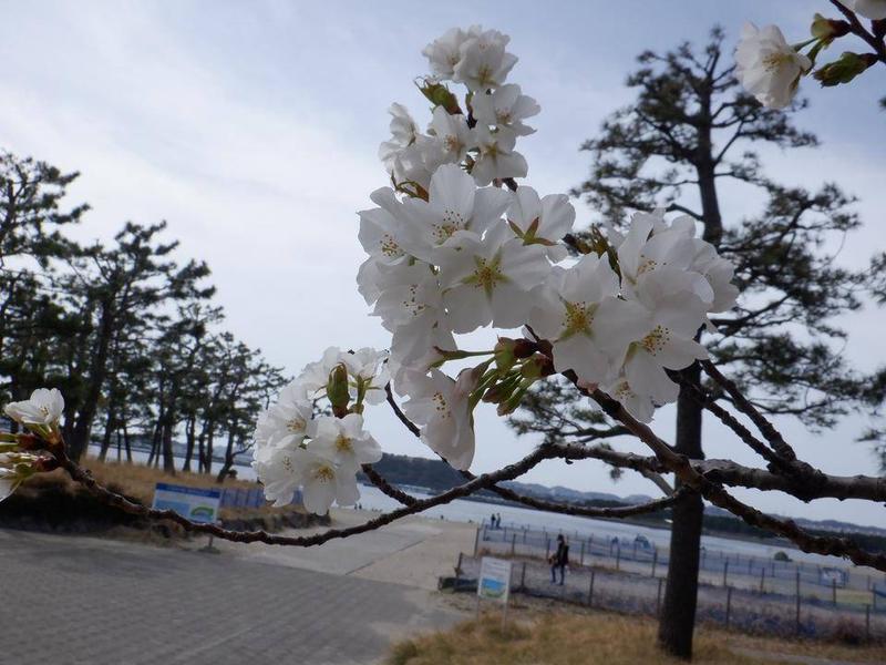 海の公園 管理センター前にある桜の標準木「オオシマザクラ」は8分咲きほどになりました。