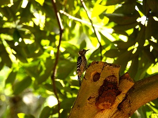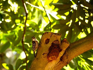 巣の中の1羽がつついて削った木くずを捨てようと、