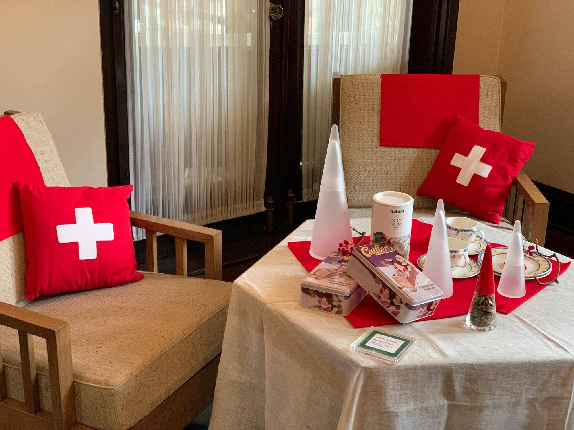 赤を基調に、スイス国旗ガちりばめられたコーディネートをお楽しみ下さい。