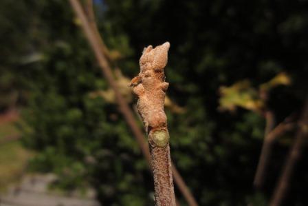 新芽が赤いアカメガシワの冬芽は、細かい毛がびっしりはえています。