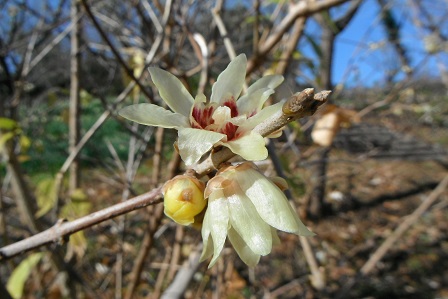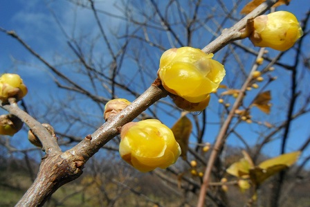 すぐ近くで「ロウバイ」も咲きだしました。ロウ細工みたいな花びらです。