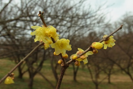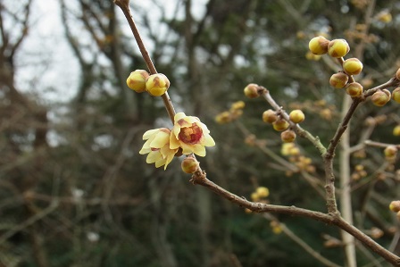 ロウバイと比べ花全体が黄色で美しく、ロウバイより若干遅れて咲き出します。