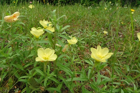 ブタナ、ミヤコグサなどがびっしり咲いていますが、もうひとつ、メマツヨイグサが加わりました。
