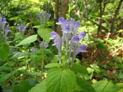 同じく、やや薄暗い木々の下にオカタツナミソウの花が鮮やかです。