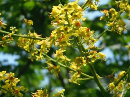「モクゲンジ」の花も満開でした。黄金色の花に赤い中心部が可愛いですね。