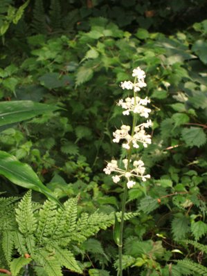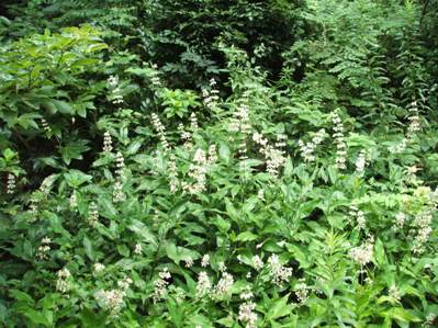 純白の花で、下方より上方へ順次花が開き、9月初旬まで咲きます。