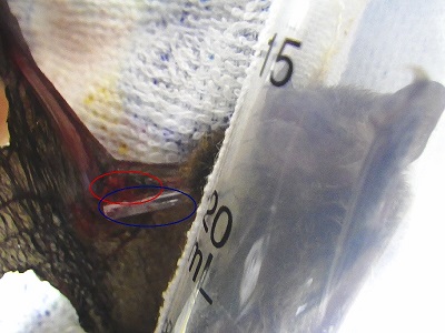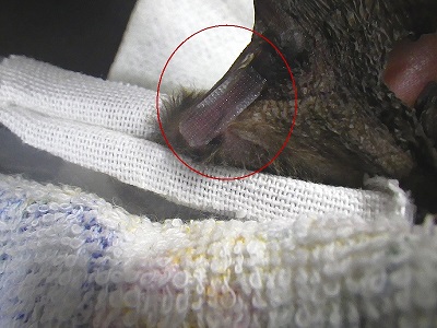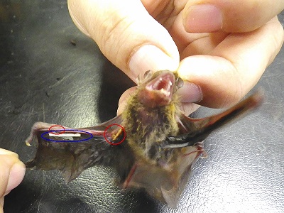 アブラコウモリの翼(腕)の骨が2カ所折れています(赤丸)。